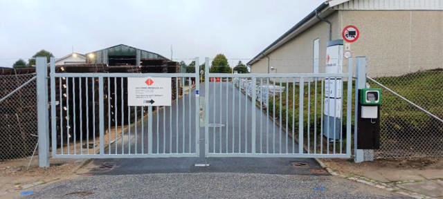 Gottfred Petersen A/S’ Hjertestarter hænger synligt, til højre ved porten til indkørslen.